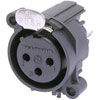 3 pole female receptacle, solder contacts, Nickel housing, silver contacts. Smallest available traditional style metal panel mount connector with large solder cups for ease hard wiring. By Neutrik.
