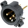 3 pole male XLR receptacle, grounding: separate ground contact to mating connector shell and front panel, steel retention lug, vertical PCB mount, black chrome shell. By Neutrik.