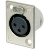 3 pole female receptacle, solder cups, Nickel housing, silver contacts. Universal D-size metal body XLR panel mount series. UL recognized component. By Neutrik.