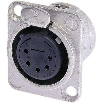 5 pole female receptacle, solder cups, Nickel housing, silver contacts. Universal D-size metal body XLR panel mount series. UL recognized component. By Neutrik.