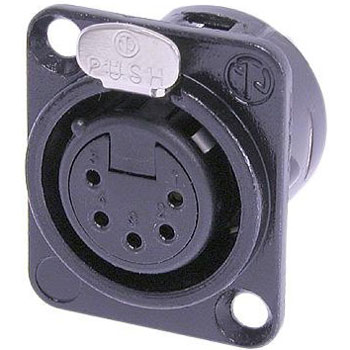5 pole female receptacle, solder cups, black metal housing, gold contacts. Universal D-size metal body XLR panel mount series. UL recognized component. By Neutrik.