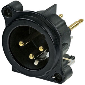 3 pole male XLR receptacle, grounding: separate ground contact to mating connector shell and front panel, steel retention lug, vertical PCB mount, black chrome shell. By Neutrik.