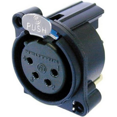 4 pole female XLR receptacle, grounding: without ground / shell contact, horizontal PCB mount, color coding possible. By Neutrik.