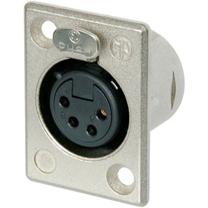 4 pole female receptacle, solder contacts, Nickel housing, silver contacts. Smallest available traditional style metal panel mount connector with large solder cups for ease hard wiring. By Neutrik.