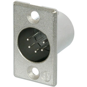 Neutrik 5 pole male receptacle, solder contacts, Nickel housing, silver contacts. Smallest available traditional style metal panel mount connector with large solder cups for ease hard wiring. By Neutrik.
