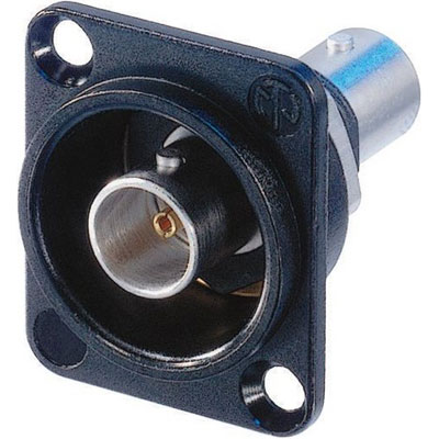 Isolated bulkhead jack, feedthrough in black D-shape housing. The bulkhead connector offers a true 75 Ω design for serial and digital (HD) signals . The machined brass connector body provides an extremely rugged and non-abrasive connection over long term use and is in addition recessed and therefore well protected in a D-shape housing (audio industry standard). By Neutrik.