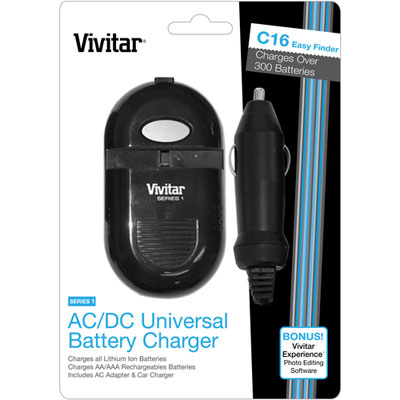 Universal Lithium-ion Battery Charger automatic detect battery voltage. It compatible with more than 300 lithium-ion batteries. It has LCD display and charging indicator. Includes a DC vehicle charger and AC adapter. By Vivitar.