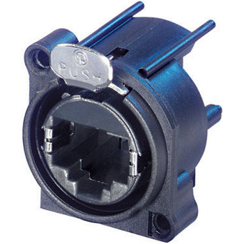 EtherCon Horizonal PCB mount RJ45 receptacle, A-Series cutout with latch lock, max. panel thickness 3 mm. The EtherCon Series is a ruggadized and lockable RJ45 connector system, optimized for proaudio, video and lightning network applications. The chassis connectors are shaped to fit into standardized panels out of the entertainment industry. Various wiring applications and color coding are available. The EtherCon all plastic A-Series offers the most space saving and cost effective design. By Neutrik.