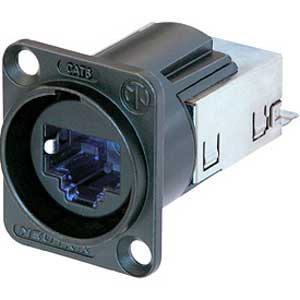 EtherCon D-shape CAT6 panel connector with black Chrome housing. The EtherCon CAT6 D-shape panel connectors with metal housing and secure latching system offer a tool-free and gas-tight IDC termination, which makes cable assembly easy and fast. By Neutrik.