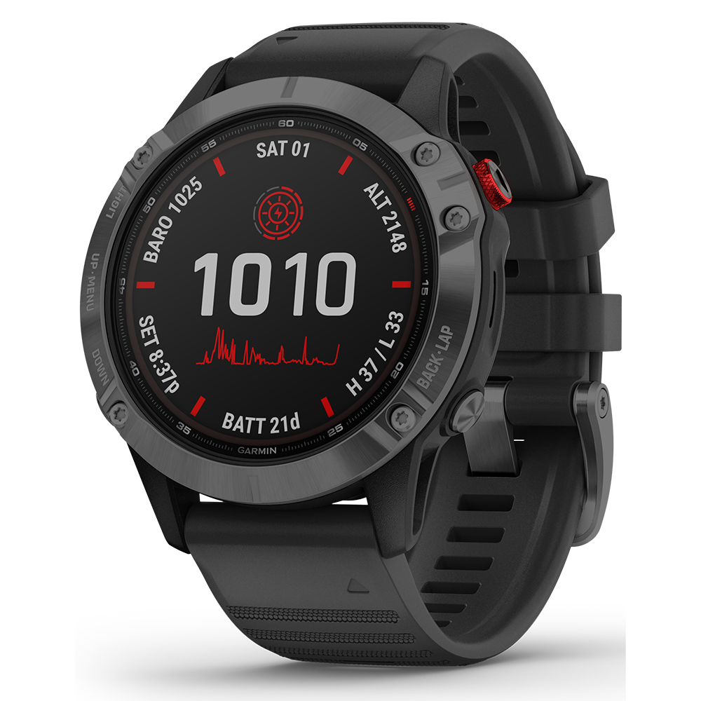 Garmin Fenix 6 - Pro Solar Edition with music, maps, and Wi-Fi, Slate Gray with Black Band, 47mm. Featuring a Power Glass solar charging lens and customizable power manager modes, this smartwatch can stay on and performance-ready for weeks. By Garmin.