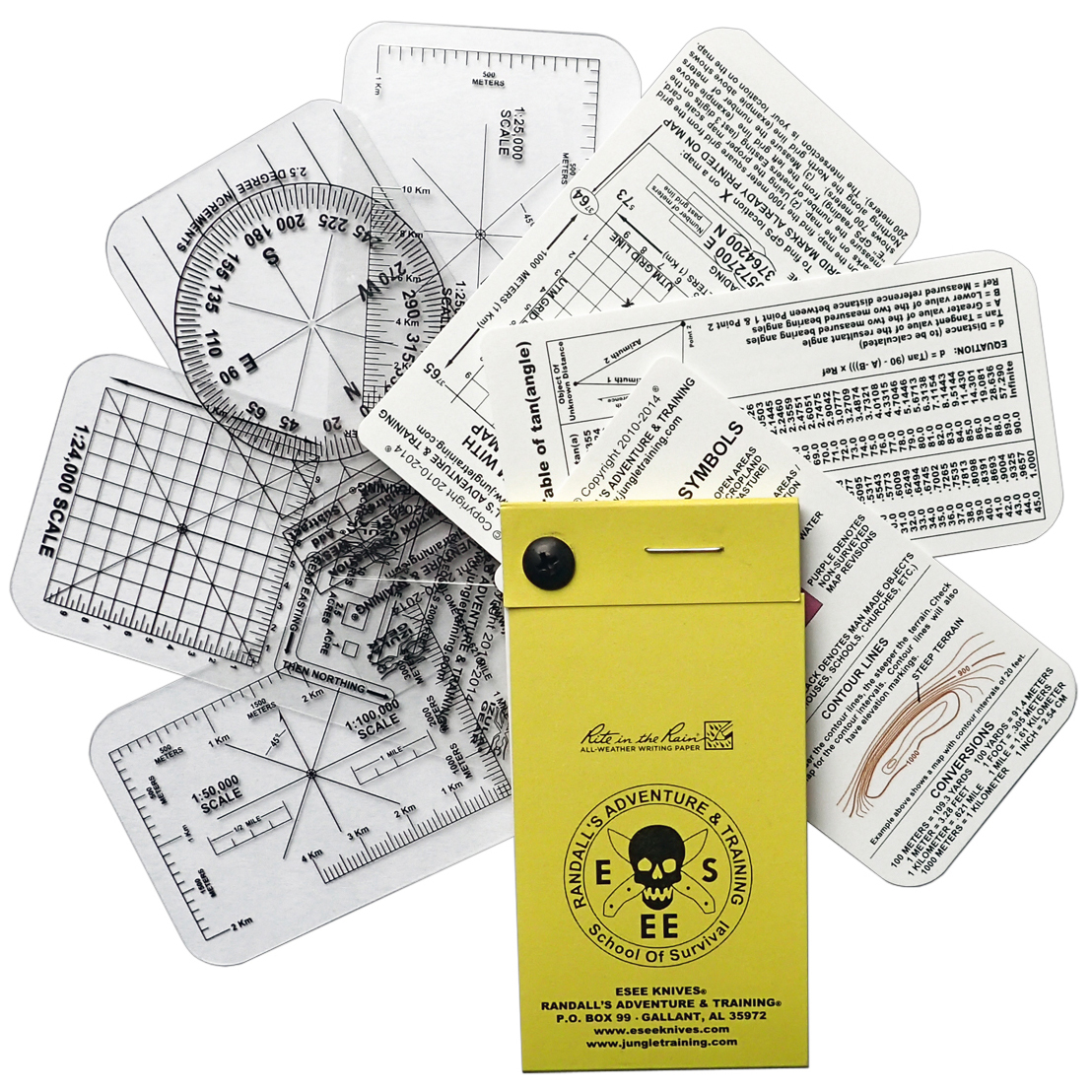 ESEE Pocket Nav Cards, 2.13" x 4.25" x .32". Of all the products ESEE/RAT has designed, the Pocket Nav Cards are at the top of the list of being the most useful for outdoorsmen. Designed to be used with a map and compass, the compact cards also allow the user to easily translate their GPS location to a map, as well as providing the inexperienced navigator with vital information on how to use map, compass and GPS. Includes micro notebook with waterproof paper, three plastic instruction cards and four clear overlay cards to determine grid locations, azimuths and distances. By ESEE Knives.