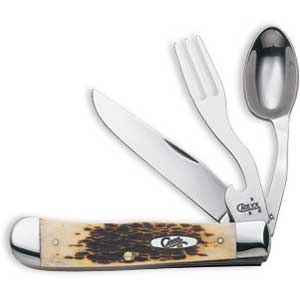 Case 6354HB SS Amber Bone Hobo Knife. Clip blade, fork, and spoon. By W.R. Case & Sons.