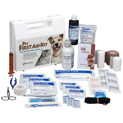 Pet First Aid Kit, 44 pc - Large. 44 piece large pet first aid kit includes all the special items your pets may need in the event of an accident. Contains bandages, wound care items, antiseptic, peroxide for vomiting, pet first aid guide. By First Aid Only.