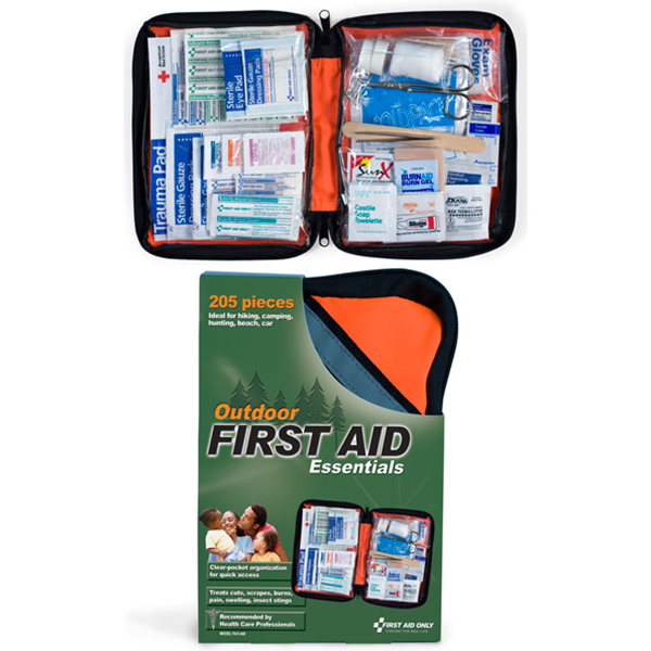 Outdoor First Aid Essentials Soft-sided Kit with Zipper, Large, 205 Pieces, Red. Perfect for hiking, camping, marine adventures, home, and auto. Our Outdoor First Aid Essentials soft-sided first aid kit features all the essential first aid items for minor aches and injuries in a sturdy nylon zippered pouch. Supplies are easy to find in our patent pending, clear-pocket pages. By First Aid Only.