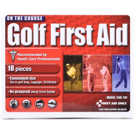 Golf First Aid Kit, 18 pc - Plastic Case. One of our most popular kits, and a must for every golf bag. Includes everything you will need for your safety on the golf course such as sunscreen, sting relief, moleskin for blisters and more. By First Aid Only.
