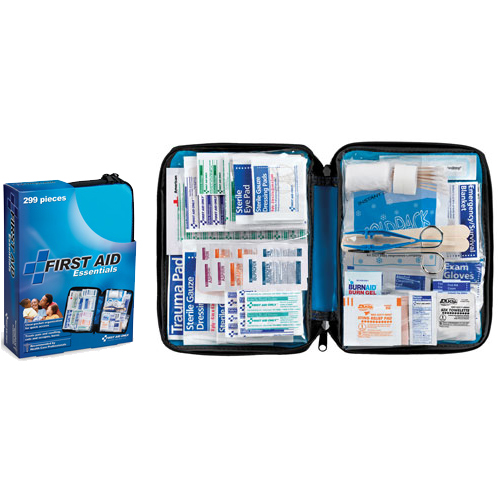 All Purpose Essentials First Aid Kit, Soft-sided with Zipper, Large, 299 Pieces, Blue. Be ready for emergencies at home, in the car, outdoors, or on the water. Our new generation of soft-sided first aid kits saves time and frustration in the midst of emergency situations. Supplies are easy to find in our patent pending, clear-pocket pages. By First Aid Only.