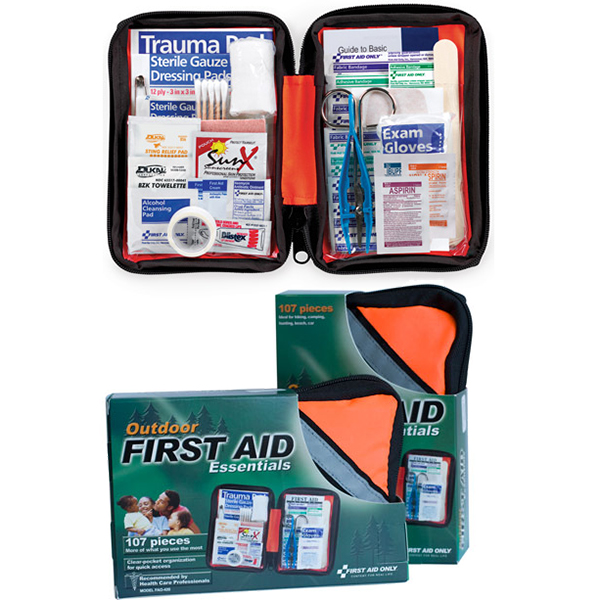 Outdoor First Aid Kit, Softsided, 107 pc - Small. Perfect for hiking, camping, marine adventures, home & auto. Our outdoor softsided kit features all the essential first aid items for minor aches and injuries. Supplies are easy to find in patent pending, clear-pocket pages. By First Aid Only.