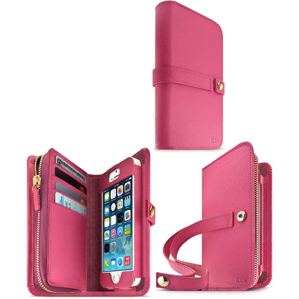 iLuv AI5JSTRPN Jstyle Runway full grain leather wallet case for ladies for iPhone 5/5S/SE. Express your sense of style with Jstyle Runway, a premium wallet case crafted from full-grain, top-grade leather with a saffiano finish. The case opens like a book to reveal four slots for your cards and a space for your iPhone 5/5S/SE. An interior zip pouch allows you to safely store your cash. Jstyle Runway offers 360-degree protection and includes a wrist strap for added convenience. By iLuv.