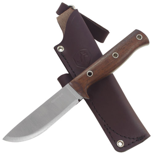 Condor Swamp Romper Knife. 3.0 MM 1075 high carbon steel polished 4 1/2" blade, walnut handle, hand crafted welted leather sheath. By Condor Tools and Knives.