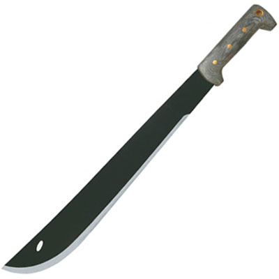 The Condor CTK2020HCM EL Salvador Machete. 1075 high carbon carbon steel, micarta handle, epoxy black powder coating finish, black leather sheath. Blade length 18", overall length 23 1/2",blade thickness 1/8", 2.02 lbs. By Condor Tools and Knives.