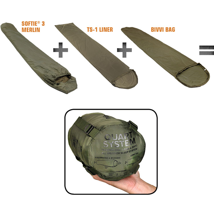 Snugpak - Quart System combines our Softie 3 Merlin with our TS-1 Liner and Bivvi bag. It can be used as a one or two season sleeping bag. There is a waterproof housing built into the stuff sack to keep the bivvi separate after use in case it is wet, so you keep your sleeping bag and liner dry. With this system, you get all three components for a reduced price, rather than purchasing them all separate. Colors available in Black (SNUGPAK-94650) or Olive (SNUGPAK-94600). By Proforce-Snugpak.