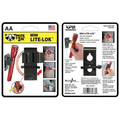 The Mini Lite Lok is a professional quality holster made of durable polymers, designed to securely hold a AA Mini Maglite. The back of its clip features two holes that allows you to anchor it over a set of nails or screws, so you can both mount it on a wall and wear it on your belt or waistband, interchangeably. And, because it rotates 360 degrees, the Mini Lite Lok allows you to aim the light exactly where you need it - hands free. It's a simple, smart way to keep your AA cell flashlight conveniently at hand when you need it, and securely stored between uses. By Nite Ize.