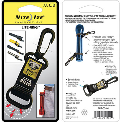 The Nite Ize Lite Ring is compact, convenient and ready for use. Fits most shapes and styles of flashlights. Clip light to a waistband or belt, clip to a wall hook for easy storage. By Nite Ize.