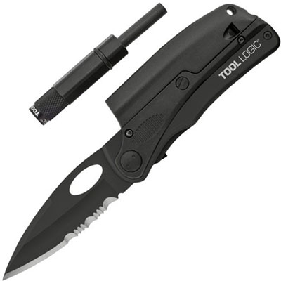 SLPro Tactical Black - Fire. The SL Pro 2 (tactical black) knife offers a razor sharp partially serrated 3" blade, emergency whistle and LED flashlight with a magnesium alloy fire rod. By Tool Logic - SOG.