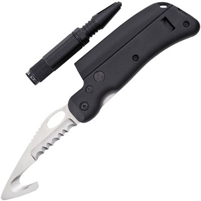 SL6 Rescue - with Flashlight/rescue window punch/whistle. At just 2.8 ounces, the SL6 is a compact and lightweight emergency rescue kit: It features blunt tipped safety blade with a seat belt/line cutter and a razor sharp serrated edge. A sleeve attached to the top of the handle holds a brilliant white LED flashlight that's waterproof for shallow immersion. When the flashlight is removed, the back of it has a superhardened window punch. Plus, the handle has a loud, built-in signal whistle and a pocket/belt clip. It's a great addition to any glove compartment, and is tough enough for EMS and law enforcement applications. By Tool Logic - SOG.