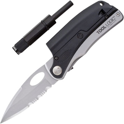 SLPro Silver - Fire. The SL Pro 2 (silver) knife offers a razor sharp partially serrated 3" blade, emergency whistle and LED flashlight with a magnesium alloy fire rod. By Tool Logic - SOG.