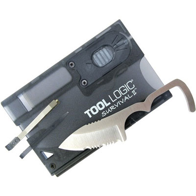 Survival Card w/ Fire Starter/Light - Charcoal. The Survival Card 2 is packed with lifesaving features: it offers a new skeletonized, serrated knife of tough AUS 8A type stainless steel, a magnesium alloy fire starter, a loud signal whistle, plus a brilliant red LED flashlight. There's also a tweezers and toothpick and a hole for lanyard attachment. Credit card size and less than two ounces, this essential tool kit deserves a place in your car, backpack and even your home. Keep the Survival Card with you and you'll always be prepared for life's unforeseen emergencies. Rugged, translucent black ABS. By Tool Logic - SOG.