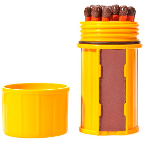 Stormproof Match Kit - Yellow. The UCO Stormproof Match Kit is a waterproof case that includes 25 matches and 3 strikers. The case features an integrated striker on the outside to provide an easy location for lighting matches and can hold up to 40 matches. By Industrial Revolution Uco.