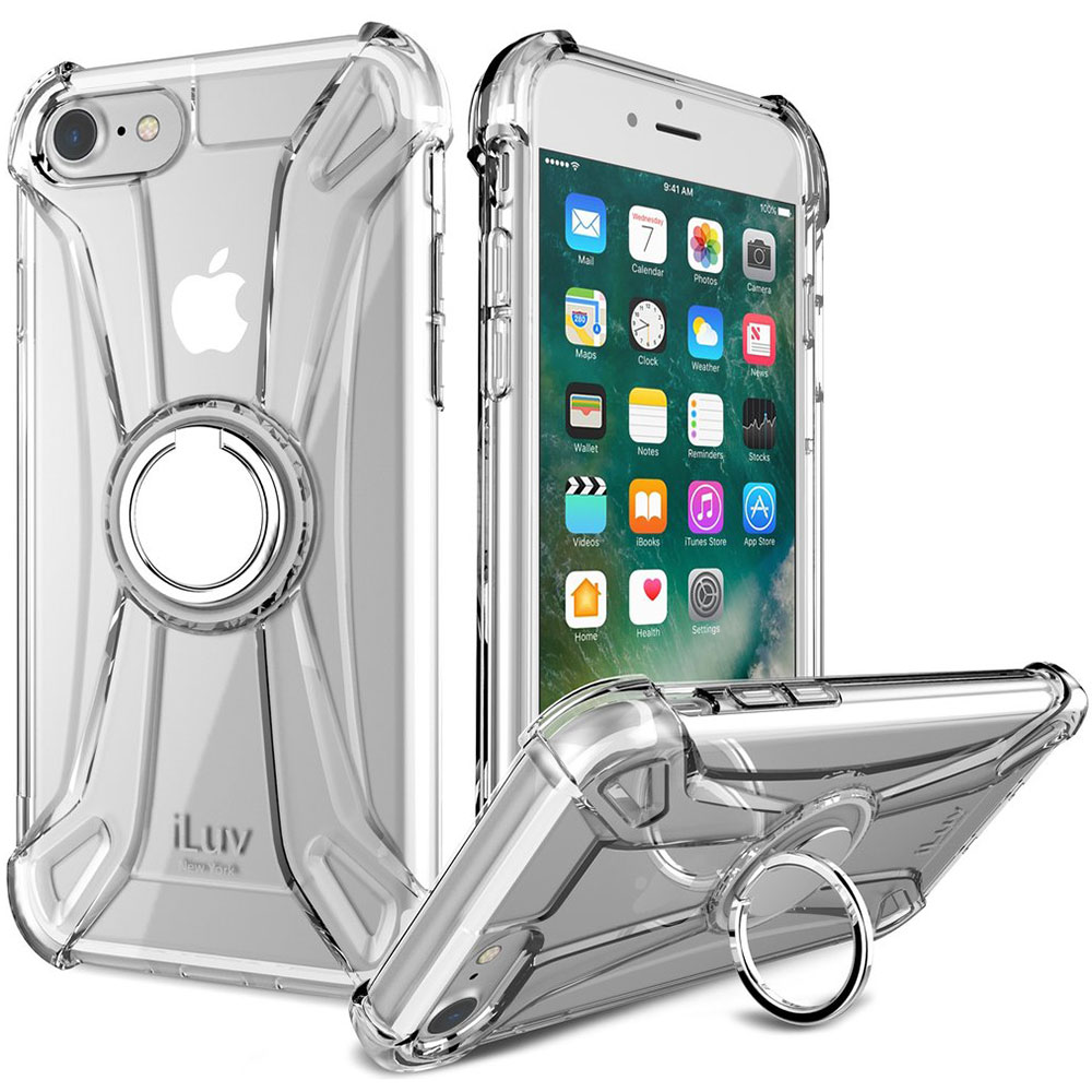 iLuv AI8CRING iPhone 8/iPhone 7 Advanced Anti-shock Flexible Clear Case With 360 Degree Rotating Finger Ring Grip/Stand Holder. Do you often drop your phone and make scratches on every spots? You can actually tightly hold the phone with your finger. Crystal Ring's integrated finger grip ring prevents your iPhone from falling off, while allowing you to hold iPhone with one hand. The 360 degree rotating ring also works as a kickstand on the table. Enjoy your video with optimum viewing angle. Its advanced anti-shock structure with shock absorbing corner design also provides extra protection. You can show off your beautiful iPhone as it is translucent. Raised lip keeps your iPhone's screen from touching any surfaces and protects the screen from accidental drop. Its package also include harm-free anti-mold chip made from recycled material instead of silica gel preserving our environment. By iLuv.