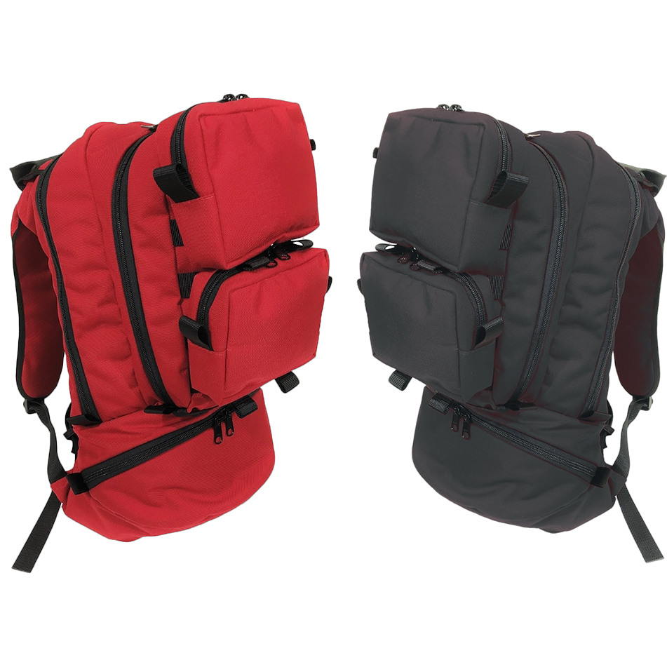 ACTIVE SHOOTER RESPONSE/SAR BACK PACK. ASK-401BK ASK-401RD Our ASR/SAR backpack is a slim-tapered pack which contours for comfort and eliminates the bulky backpack when concealment is important or tight locations are encountered. This pack consists of 3 zippered pockets, capable of holding 8 Patient Treatment Kits, and two removable outer pockets for accessories. The main compartment is 21”L x 10”W x 5”D. It has full length Velcro® compatible foam for protection and comfort. There is a convertible Velcro® divider for extra storage. All internal pockets can be held in place by Velcro® and are quickly deployed. The middle compartment is approximately 14”L x 7”W x 3 1/2”D, with MOLLE webbing for attaching additional pockets. The lower fanny pack compartment is 8”L x 10”W x 5”D. The back pack has a web carrying handle, padded contoured shoulder straps, chest strap and waist strap as well as slot provisions for a hydration pack hose. This is made using DuPont® Cordura® and #8YKK self repairing zippers. It is available in black or red and weighs 36 oz. The overall dimensions are 21”L x 12”W x 12”D. By R&B Fabrications.