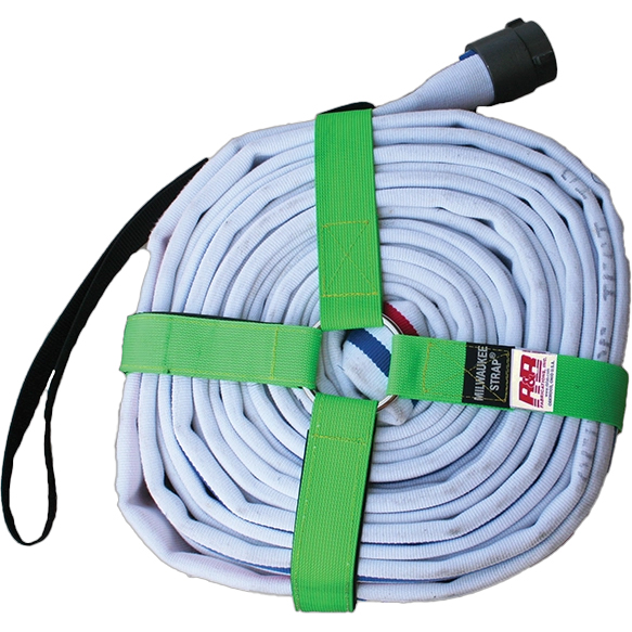 THE DOUBLE DONUT STRAP. #DD-100. The Double Donut Strap holds two, 50’ sections of 1 3/4” hose. Heavy-duty nylon webbing and high-sheer strength Velcro® make up this strong and functional product. Important features include: easy storage — hose stacks and is compact enough to fit into compartments, shoulder strap aids firefighters in carrying and deploying hose, and pre-coiled hose gives you an option to add on to an existing hose lay, or reduce a larger line. Adjustable from 42”- 50” and the weight is 32 oz. By R&B Fabrications.