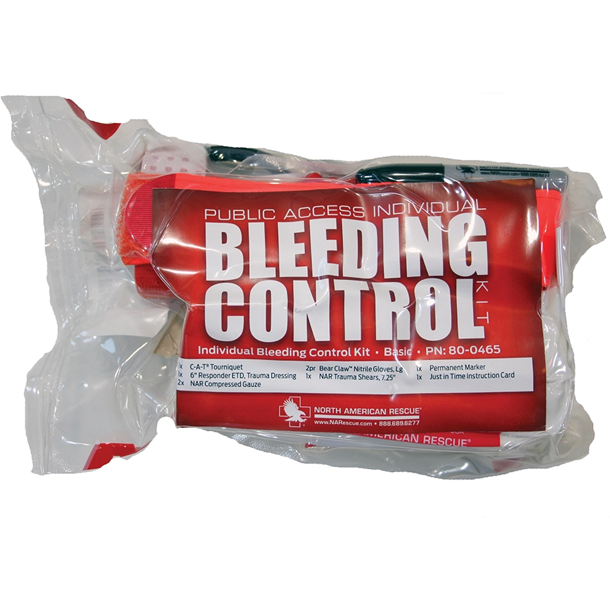 Bleeding Control Kit. Bleeding Control Kits provide the essential tools needed to stop bleeding quickly. Whether they are needed for a car accident or an active shooter situation, these kits can provide the medic, or even the general public, to act as a responder. There are three levels of kits: Basic, Intermediate and Advanced. The Bleeding Control Kit comes in a vacuum sealed pouch with all of the contents sealed securely inside for a longer life-span. Sealed kits fit directly into the Empty IFAK/Active Shooter Response Pouch for easy transport. Overall measurements are 7”L x 4”W x 3”D. Weight 15 oz. By R&B Fabrications.
