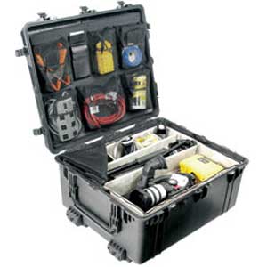 Pelican 1690 Transport Case. Easy open Double Throw latches, Retractable extension handle, 4 strong polyurethane wheels with stainless steel bearings. The case is watertight, crushproof, and dust proof. By Pelican.