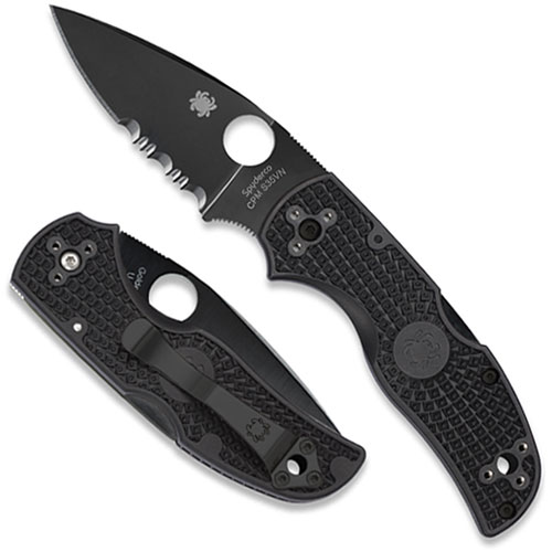 Spyderco C41BBK5 Native 5 Knife with black FRN handle and black CPM S35VN blade. Spyderco's black-bladed Native Lightweight has long been the cutting tool of choice of savvy tactical knife users. With the introduction of the fifth-generation Native 5, however, that bar has just been raised. The black-bladed Native 5 Lightweight combines all the improvements that define this advanced design with the ultra-lightweight advantages of an injection-molded fiberglass-reinforced-nylon (FRN) handle and a low-profile black finish on the blade and other metal hardware. By Spyderco.