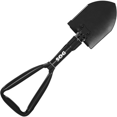 Entrenching Tool F08. A folding shovel can be an indispensable tool in today's constantly changing environment. We know one thing, when you need to move sand, dirt or snow you wish you had that shovel close at hand. Our all steel construction entrenching tool uses a tempered steel blade with teeth cut into it for cutting and slashing. The triangular handle is strong and fits the hand well. Folded, it takes up about the same space as a stack of paper plates. By SOG Knives.