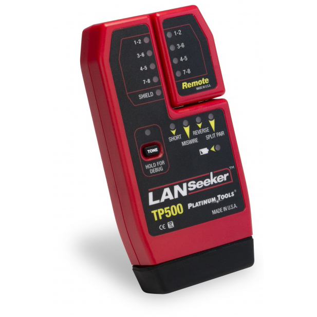 LANSeeker Cable Tester TP500. The LANSeeker is a fast, rugged cable tester and tone generator in one unit. It displays cable test results using LED indicators on the main and remote unit. An easy-to-use professional grade tool, the LANSeeker is a must have for residential and commercial cable installers. When the unit senses a connection between the main and remote unit, the battery-saving auto-on feature initiates test results within 2 seconds. The tester automatically powers off within 5 seconds of the cable being disconnected. LANSeeker tests for shorts, opens, miswires, reversals, and split pairs and can display connection and fault information on a pair-by-pair basis. It also generates audio tones for use with tone tracers on all pairs. By Platinum Tools.