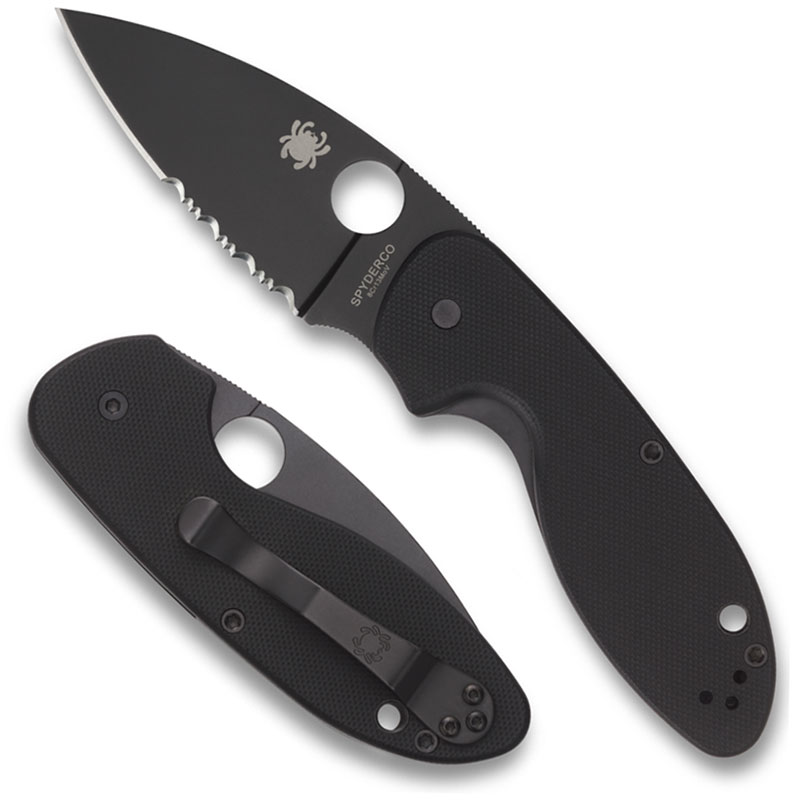 Spyderco C216GBBK Efficient Black Blade. Designed from the ground up to be an affordably priced, performance-oriented folding knife, the Spyderco Efficient has earned a devoted following among savvy knife users who appreciate a solid value. To make this workhorse cutting tool even better suited to the needs of tactically oriented end users, Spyderco now offers it in an all-black configuration featuring a non-reflective black oxide blade coating and matching black liners and handle hardware. Its 8Cr13MoV stainless steel blade is full-flat ground for superior edge geometry and is available in both PlainEdge and partially serrated CombinationEdge configurations. An index-finger choil at the base of the blade allows a choked-up grip for enhanced control and Spyderco's Trademark Round Hole provides swift, one-handed opening. The blade is paired with an ergonomic handle that includes full stainless steel liners, a sturdy LinerLock mechanism, textured G-10 scales, a lined lanyard hole, and a reversible hourglass clip that can be configured for left or right-side tip-up carry. By Spyderco.