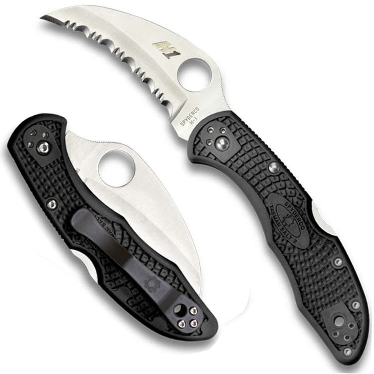 Spyderco's second-generation Tasman Salt 2 is a powerful fusion of a hawkbill blade profile, 100% rustproof H-1 blade steel, and an enhanced, injection-molded handle design. The result is an incredibly capable pocket-sized cutting tool that is ideal for anyone who works in or around the water. Available with either a PlainEdge or fully serrated SpyderEdge cutting edge, the radically curved hawkbill blade of the Tasman 2 literally collects the material it cuts, drawing it into the concave edge like an animal’s claw. This dynamic generates extreme cutting power, especially on fibrous, hard-to-cut materials like netting, line, webbing, and rope. The Tasman Salt 2's high-performance blade is housed in an improved handle design based on Spyderco's best-selling Delica 4. Injection molded from tough, ultra-lightweight yellow or black fiberglass-reinforced nylon (FRN), it features improved ergonomics, a non-slip Bi-Directional Texturing pattern, and a series of threaded stainless steel anchors for a versatile four-position titanium pocket clip. The handle is also home to a stout back lock mechanism that locks the blade securely open during use. A true pocket powerhouse, the Tasman Salt 2 sets a new standard in mariner's cutting tools. By Spyderco.