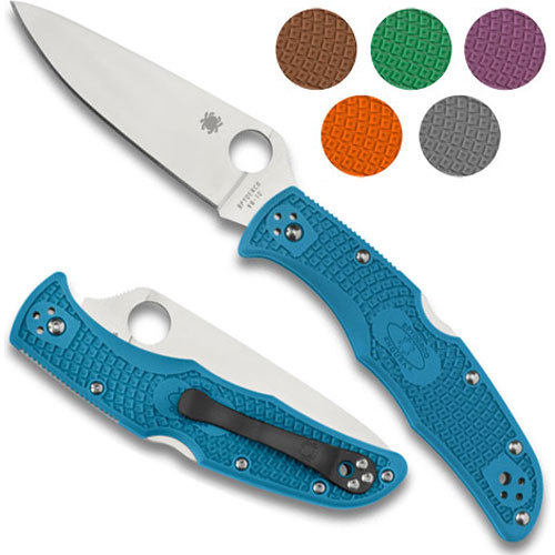 The C10FG Endura 4 with full-flat ground plain edge blades. Handle Color available in black (C10FPBK), blue (C10FPBL), brown (C10FPBN), gray (C10FPGY), green (C10FPGR), orange (C10FPOR), or purple (C10FPPR). By Spyderco.