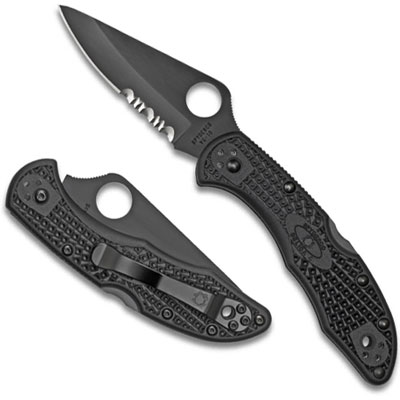 This version of the popular Delica4 has a non-reflective VG-10 blade that is coated with black titanium carbonitride and is flat saber-ground, has a strong tip and large 13mm opening hole. Added to the blade's spine is slip resistant jimping. Phosphor bronze washers smooth out the open/close action and the clip is upgraded to a four-way tip-up, tip-down, left- or right-handed clip. The fiberglass reinforced nylon handles come molded with Bi-Directional Texturing for preferred traction and improved ergonomics. Inside the handle dual skeletonized stainless steel liners make the knife stronger without adding weight and make an anchor for all external and internal components to attach through adding sturdiness and rigidity. By Spyderco.