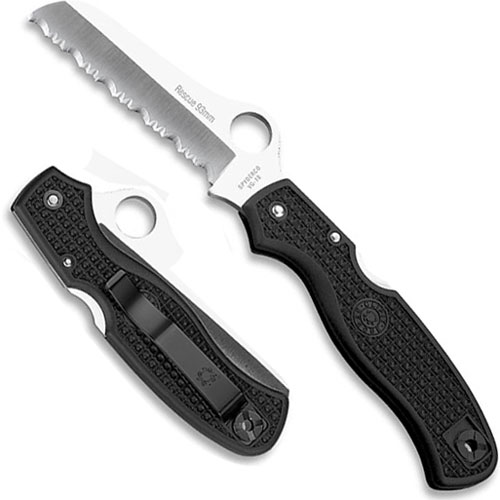 Spyderco Rescue 93mm Black FRN. Spyderco's Rescue knives are long favored by seafarers and the design has since been embraced by rescue workers, EMT's and ranchers-anyone cutting around flesh in an emergency. Spyderco's Rescue sheepfoot blade is flat saber-ground VG-10. The Spyderco Trademark Round Hole is enlarged to 14mm resulting in an enlarged hump that boosts ergonomics, strengthens the blade and lessens fatigue during long term/repetitive cutting. Spine texturing, a deep choil and volcano grip keep the knife from slipping in the hand. FRN handle comes equipped with an ambidextrous tip-up carrying clip. By Spyderco.