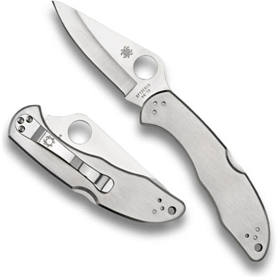 The stainless steel Delica 4 fills your palm with a handful of steel yet doesn't seem weighty or unwieldy. Knife Knuts who prefer something heavier and stouter seem to gravitate to steel handled knives. Since the handle surface is flat and smooth it offers an ideal palette for engraving or personalizing your knife. By Spyderco.