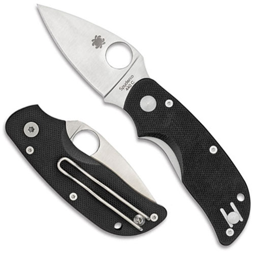 Spyderco C129GP Cat with black G-10 handle has a leaf-shaped 440C blade just under two-and-a-half inches in length that is flat-ground for hair popping sharpness. By Spyderco.