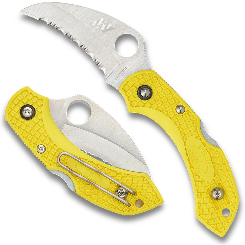 Spyderco C28SYL2HB Dragonfly 2 Salt Lightweight Hawkbill. This remarkable knife combines the proven design of the Dragonfly 2 platform, the incredible rustproof qualities of H-1 steel, and the extreme cutting power of a hawkbill blade. Like an animal's claw, hawkbill blades pierce with the tip and collect the object being cut, drawing it into the concave edge to generate highly focused cutting power. This makes them the perfect tools for cutting netting, line, and other fibrous materials. When rendered in H-1 steel - an advanced nitrogen-based alloy that is completely immune to rust - and supercharged with an aggressive fully serrated SpyderEdge, the Dragonfly 2 Hawkbill's blade cuts with an authority far beyond is compact size. By Spyderco.