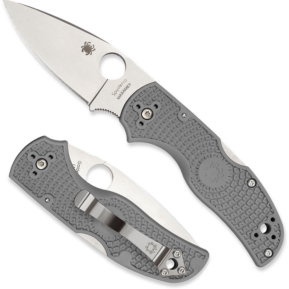 Spyderco C41PGY5 Native Lightweight Grey Maxamet combines the highly refined form, function, and ergonomics of our proven Native 5 Lightweight model with Carpenter steel's state-of-the-art Micro-Melt Maxamet blade steel. Maxamet is an extremely hard high-speed powdered tool steel possessing properties that transcend conventional high-speed tool steels and approach those of cemented carbides - the ultra-hard materials used to machine other steels. When Carpenter developed this amazing alloy for the rollers in their steel mills, they sent samples to various companies in the knife industry to evaluate as a blade material. Although many tried, Spyderco was one of only a handful of companies to successfully develop the specialized methods necessary to machine, heat treat, and grind this demanding material to yield reliable, high-performance knife blades. We are now proud to offer it in selected models made in our U.S. factory in Golden, Colorado. By Spyderco.