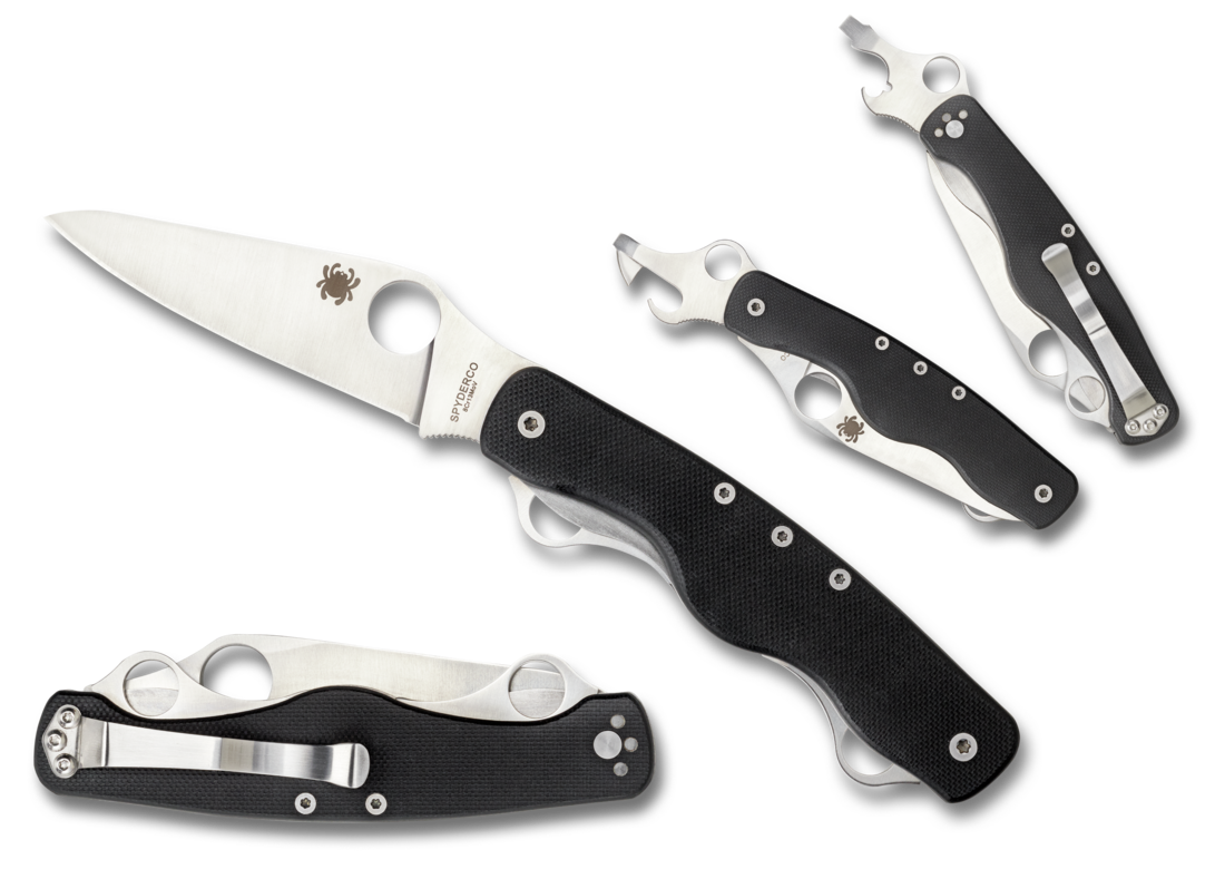 Spyderco C208GP Clipitool Standard elevates the original concept of the ClipiTool family to a full-sized pocketknife with two additional folding tools. The star attraction of this design is a full-flat-ground leaf-shaped blade crafted from 8Cr13MoV stainless steel. It locks securely open via a stout LinerLock mechanism and is complemented by a folding can opener/small screwdriver and a bottle opener/large screwdriver with a wire-stripping notch. Both screwdriver heads are hollow ground to ensure a secure fit in slotted screws. Although they do not lock, they are supported by sturdy slipjoint spring mechanisms to keep them open during use. Like the primary blade, both tools are precision machined from 8Cr13MoV stainless steel and feature generously sized Trademark Round Holes. This signature feature proudly identifies the knife's Spyderco pedigree and allows all three tools to be swiftly and easily opened with only one hand. The handle of the ClipiTool Standard is built on a framework of nested stainless steel liners, textured black G-10 scales, and solid stainless steel backspacers and springs. Its screw-together construction ensures the precise alignment of all parts, and a two-position hourglass clip provides a choice of right-side tip-up or tip-down carry. By Spyderco.